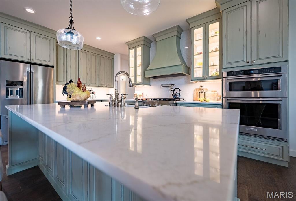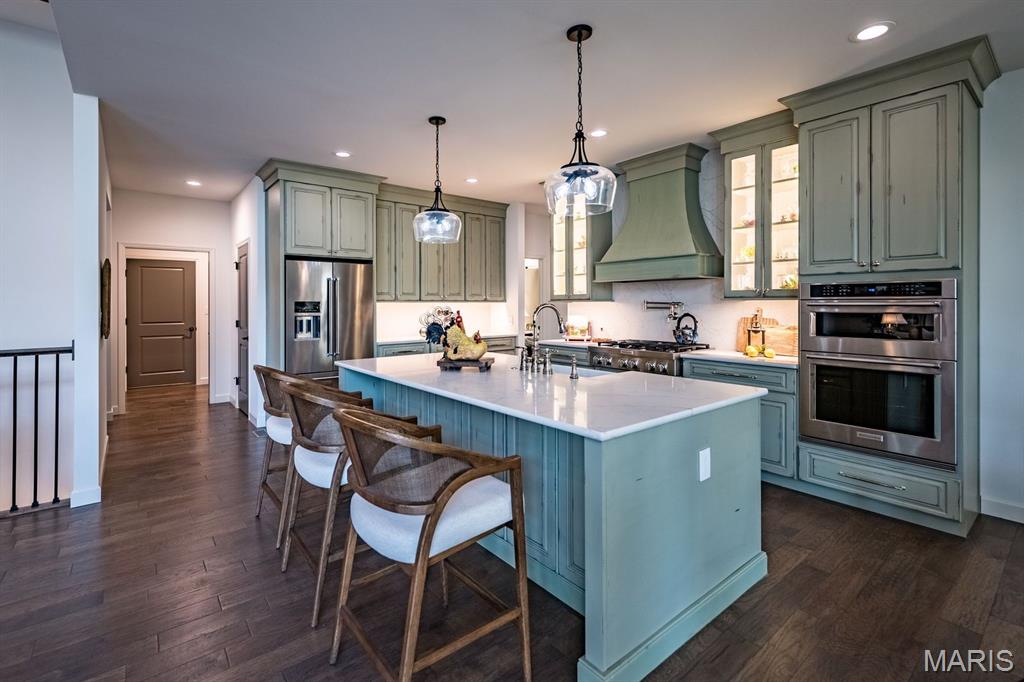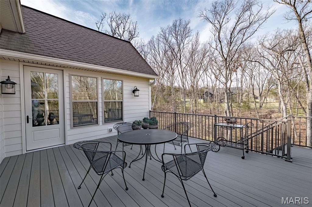 Welcome to 150 Del Creek Crossing—are you ready for an exceptional living experience? This custom-built home has been barely lived in and showcases thoughtful craftsmanship at every turn. Every corner features a custom touch you’re sure to fall in love with. The open floor plan offers sophisticated interior detailing and upscale appointments throughout. As you approach the home, you’ll immediately notice the peaceful, relaxing setting, complete with the tranquil sounds of water flowing across the pond’s rocks. Step through the custom front door and you’re welcomed by warm hardwood floors that flow beautifully throughout the main living spaces. Just off the entry, a private office provides the perfect space to work or unwind away from the main living areas. The elegant dining room greets you with style and functionality. As you move into the great room, stunning wood ceiling beams highlight the exceptional craftsmanship of the home. The designer kitchen is a true centerpiece, featuring custom cabinetry, quartz countertops, stainless steel appliances, and a large center island ideal for gathering. The hearth room fireplace creates a warm, inviting space to enjoy while cooking or transitioning to the deck. The primary suite offers a true retreat, with ample space to relax, along with a freestanding tub and walk-in shower. On the opposite side of the home, two additional bedrooms and a full bath provide comfort and convenience for family or guests. The finished lower level is designed for both entertainment and leisure. It includes a well-appointed kitchen area with a wet bar, two custom under-counter refrigerators, a microwave, and plenty of space to dine, play, and unwind. An additional bedroom features peaceful wooded views and access to a beautifully finished bathroom. With minimal prior occupancy, this home feels nearly new and offers all the modern features you’re looking for—located within the highly sought-after Wentzville School District. Let’s make this dream home your reality.